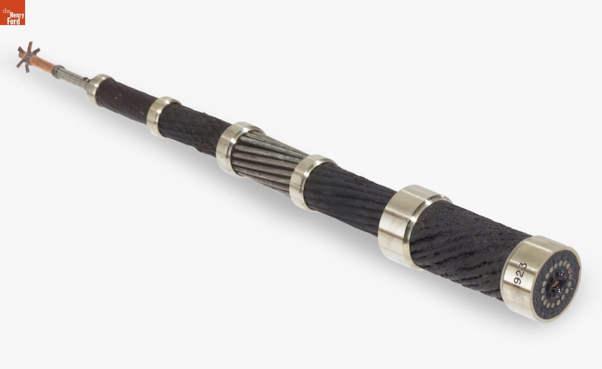 This cable is part of a display of transatlantic telegraph cables dating from 1858-1928. This cable section was part of a system laid from Valentia, Ireland to Sennen Cove, England in 1923.