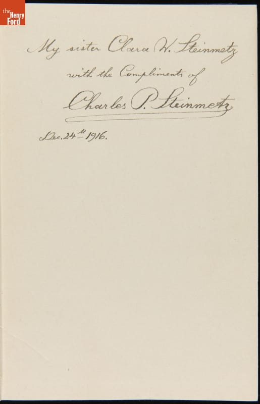 inside front cover, facing page: My sister Clara W. Steinmetz / with the compliments of Charles P. Steinmetz / Dec 24th 1916