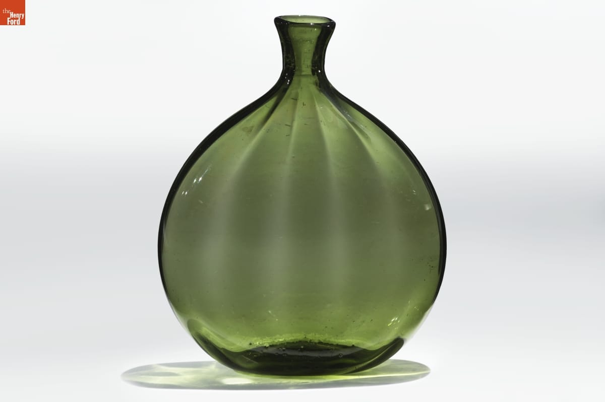 American glass factories produced flasks, like this one, from the late 1700s well into the mid-1800s. The pint-sized flask could hold water but more likely contained alcoholic beverages. Its textured decorative exterior -- formed when the hot glass was dipped into a pattern mold before it was blown -- made the flask easier to grasp. And its flattened shape fit nicely into pockets providing ready access to the liquid refreshment.