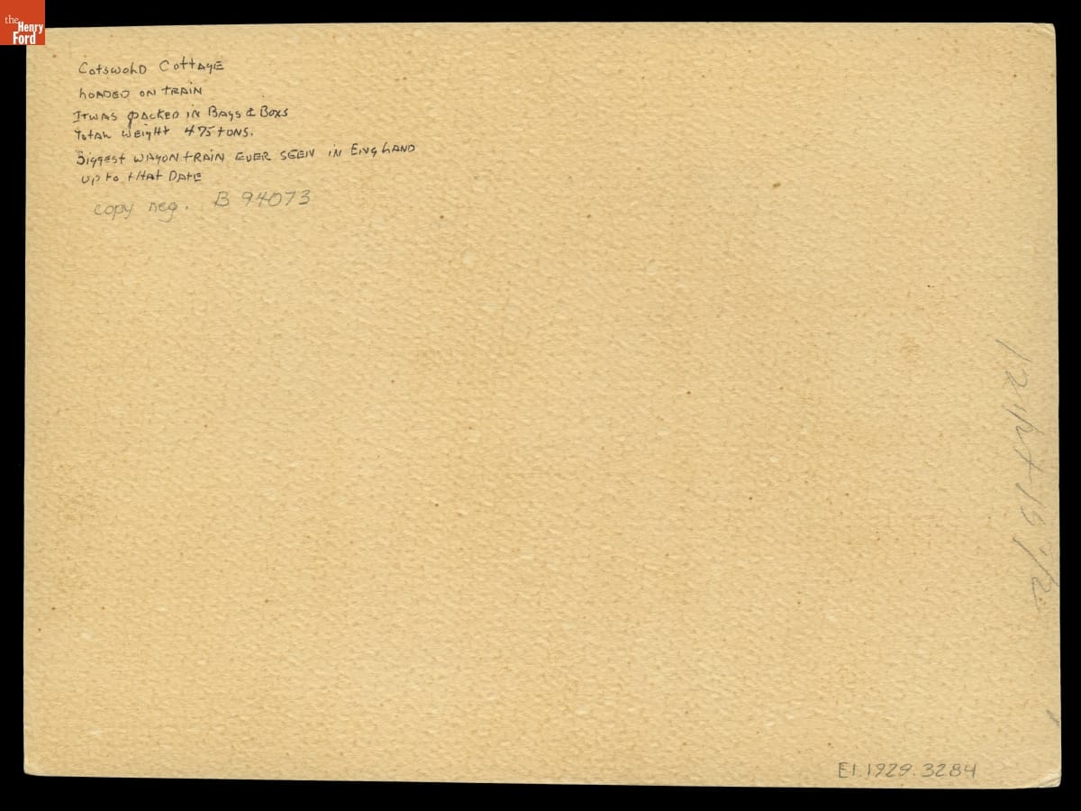 Railroad Cars Carrying the Dismantled Cotswold Cottage Away from Its Original Site in England, 1929-1930