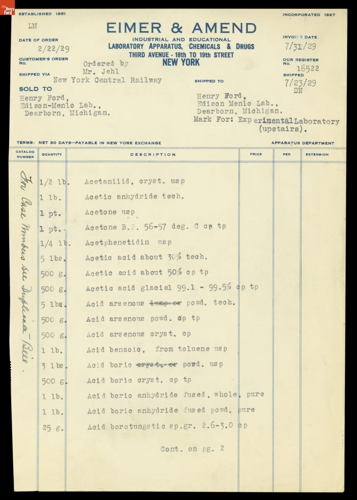 Invoice for Chemicals to be Exhibited in Menlo Park Laboratory in Greenfield Village, July 31, 1929