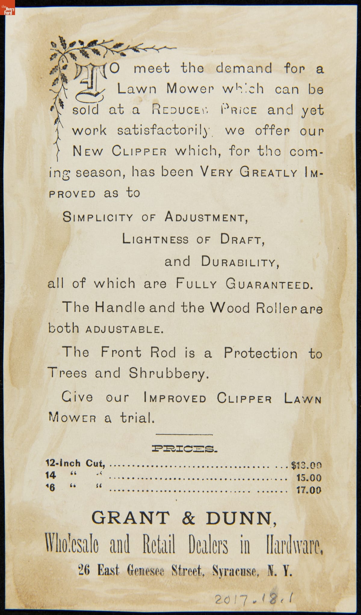Advertised product manufactured by Chadborn & Coldwell Mfg. Co., and sold by Grant & Dunn, a hardware dealer in Syracuse, New York.