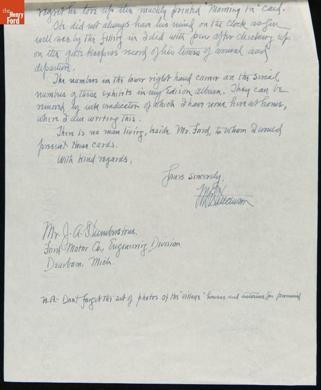 Letter from Miller Reese Hutchison regarding Donating Thomas Edison Time Cards to Henry Ford Museum, January 8, 1930