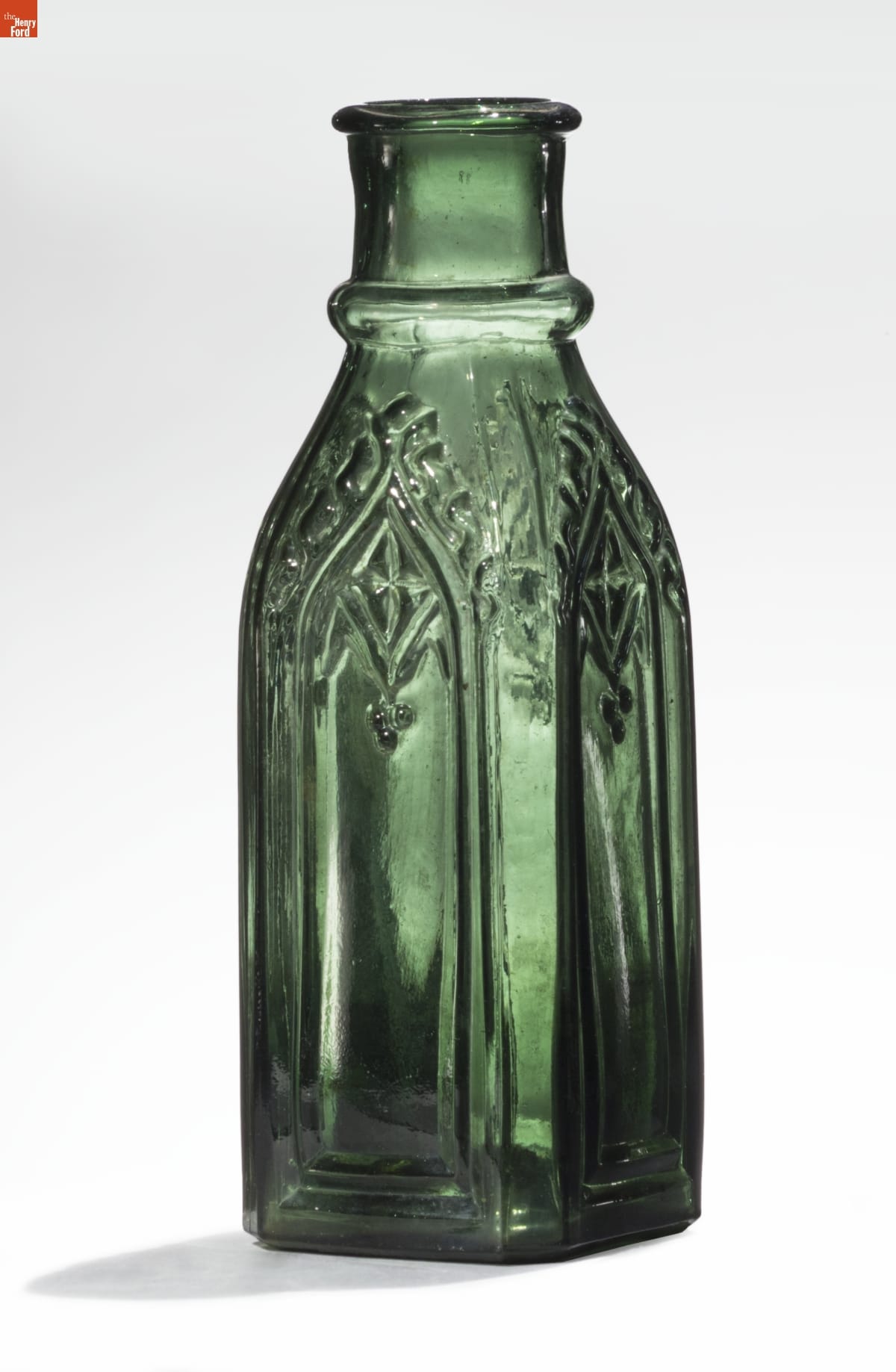 Americans in the mid-to-late 19th century purchased a variety of pickled and preserved foods in inexpensive, commercially made glass containers. Though cheap, some of these utilitarian bottles were distinctive in their decorations. This gothic-inspired bottle with its pointed arches and trefoils appealed to the tastes of many 19th-century middle class Americans and was found sitting on pantry and cupboard shelves, or atop kitchen tables.