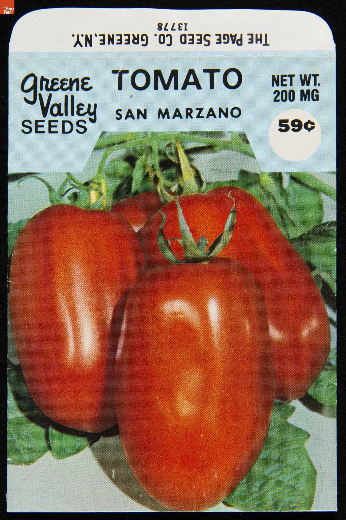 on front, top: Greene Valley SEEDS / TOMATO / SAN MARZANO / Net Wt. 200 MG 59c on back, top flap: THE PAGE SEED CO. GREENE, N.Y. on back, bottom flap: Packed for 1998 / Run No. 2