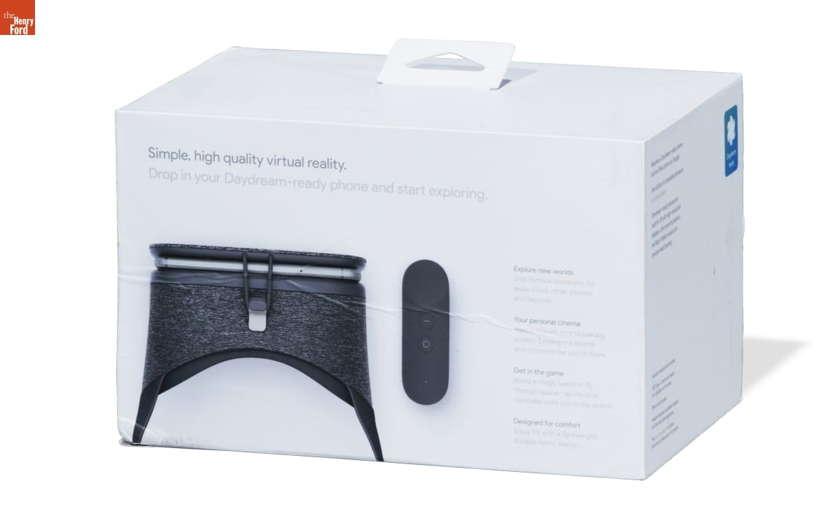on front of box: Daydream View / VR Headset by Google on back of box: Simple high quality virtual reality. Drop in your Daydream-ready phone and start exploring. / Explore new worlds. Visit famous museums, far away cities, other planets and beyond. / Your personal cinema. Watch movies on a virtual big screen. Experience sports and concerts like you're there. / Get in the game. Wield a magic wand or fly through space - an intuitive controller puts you in the action. / Designed for comfort. Enjoy VR with a lightweight durable fabric design.
