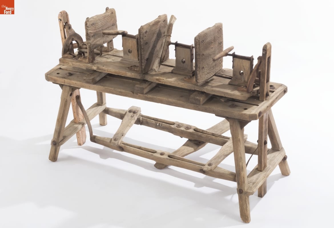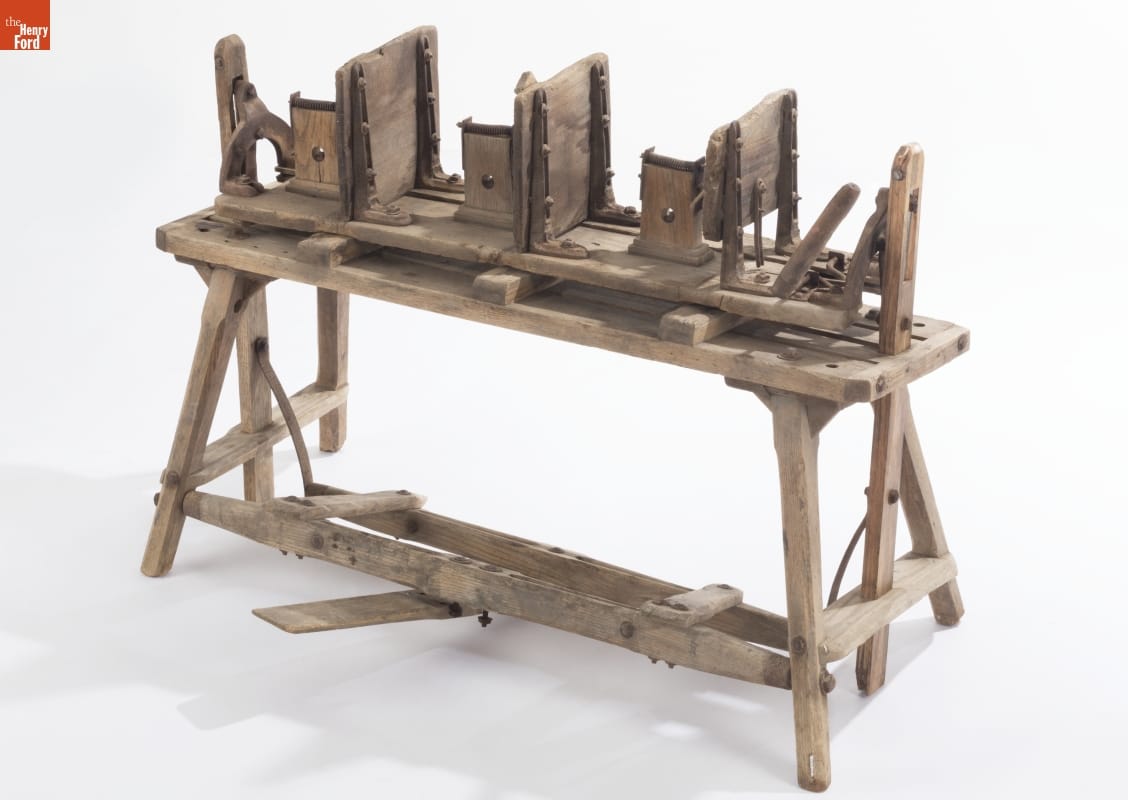 Civil War veteran James K. Ashley patented this machine in 1896. Egg farmers used it to build uniform boxes that held 360 eggs each. Farmers clamped wood boards between the vices, and then nailed the sides, middle and bottom together to complete a box. They stenciled finished boxes with the farm name and other advertising before shipping their eggs to urban markets.