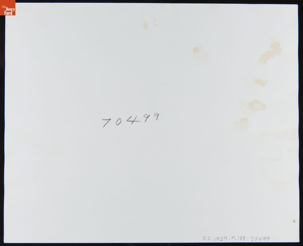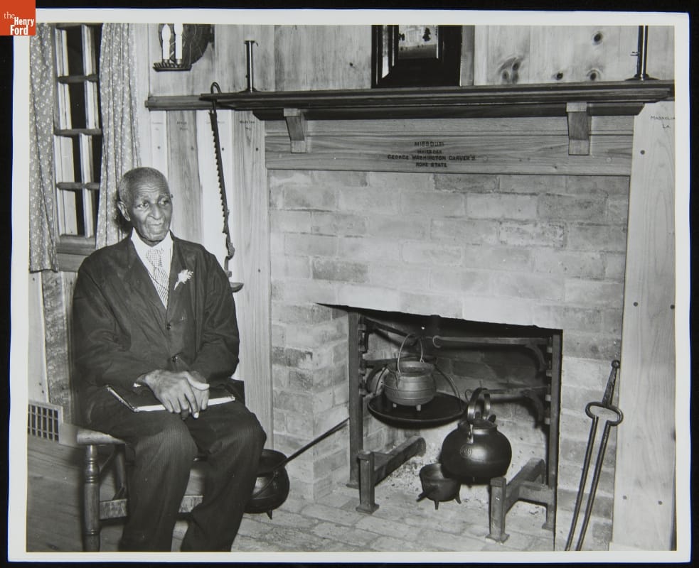 Henry Ford first thought of a building dedicated to George Washington Carver after the two met in 1937. Construction got underway in Ford's Greenfield Village in the spring of 1942. Ford's architect loosely based the building on Carver's descriptions of his southwest Missouri birthplace. Carver visited for the dedication in July 1942 and is seen here sitting next to the fireplace.