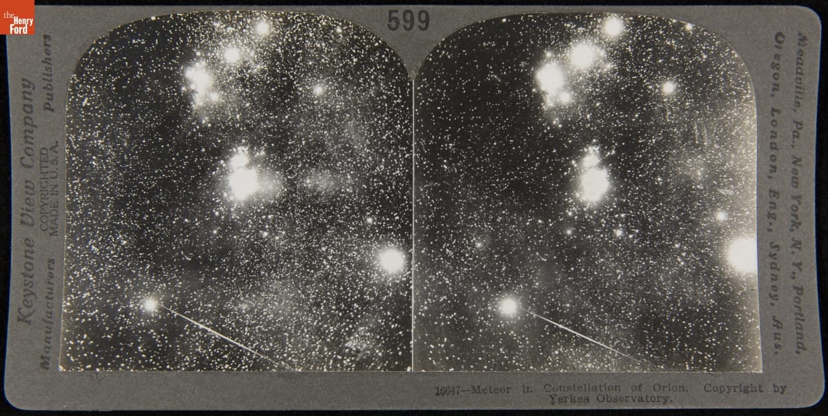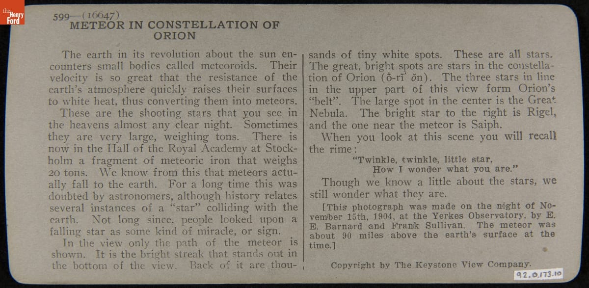 front, left side: Keystone View Company / Manufacturers / COPYRIGHTED / MADE IN U.S.A. / Publishers front, top: 599 front, right side: Meadville, Pa., New York, N.Y., Portland, Oregon, London, Eng., Sydney, Aus. front, bottom: 16647--Meteor in Constellation of Orion. Copyright Yerkes Observatory.