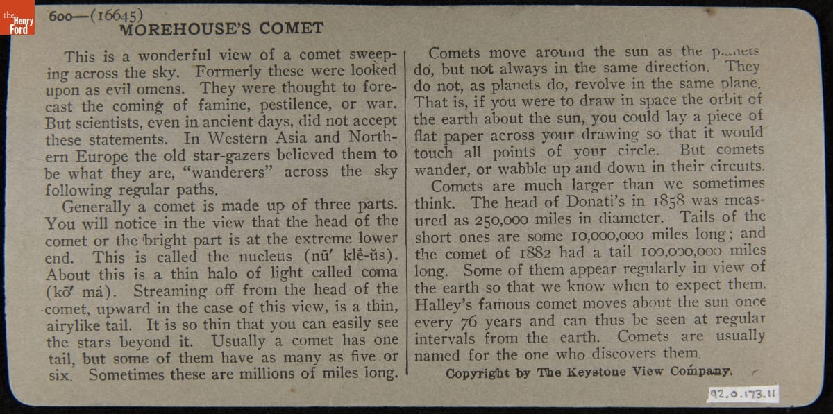 front, left side: Keystone View Company / Manufacturers / COPYRIGHTED / MADE IN U.S.A. / Publishers front, top: 600 front, right side: Meadville, Pa., New York, N.Y., Portland, Oregon, London, Eng., Sydney, Aus. front, bottom: 16645--Morehouse's Comet. Photographed at Yerkes Observatory.