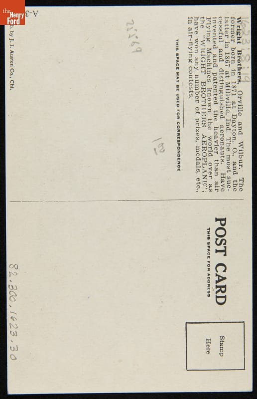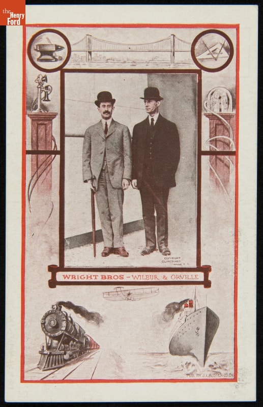 This postcard put the 1903 Wright Flyer -- and its builders, Wilbur and Orville Wright -- into context with other triumphs of engineering and invention. It surrounded the Wright brothers and their airplane with an anvil, a suspension bridge, drafting tools, a telephone, a stock ticker, a steam locomotive, and an ocean liner.