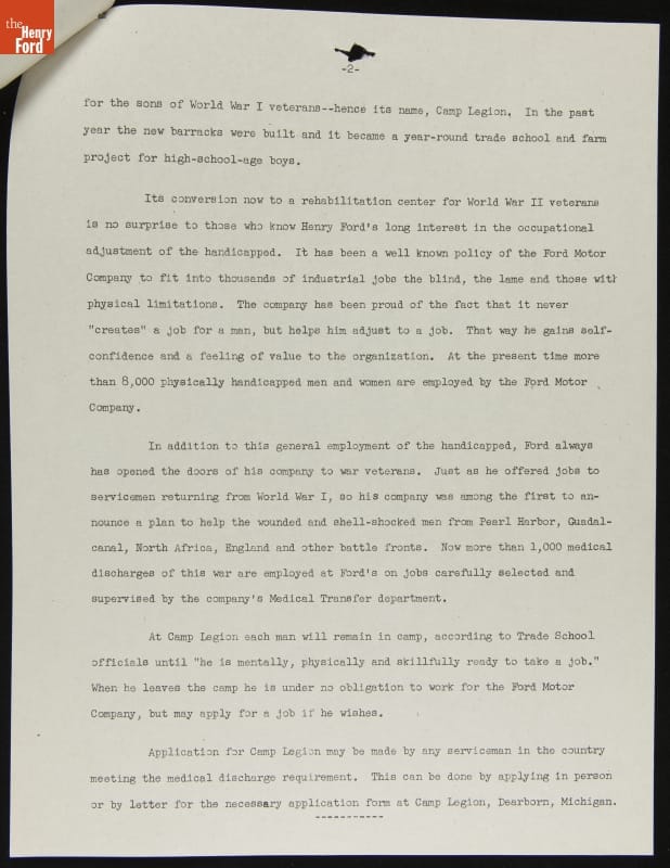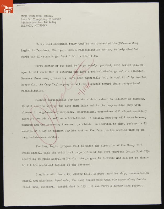 Henry Ford Converts Camp Legion into Rehabilitation Center for Disabled Veterans, Ford Press Release, 1944