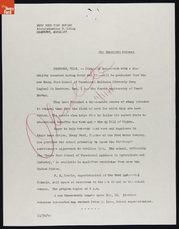 Sixty-six Men Graduated from Vocational School at Camp Legion, Ford Press Release, November 1945
