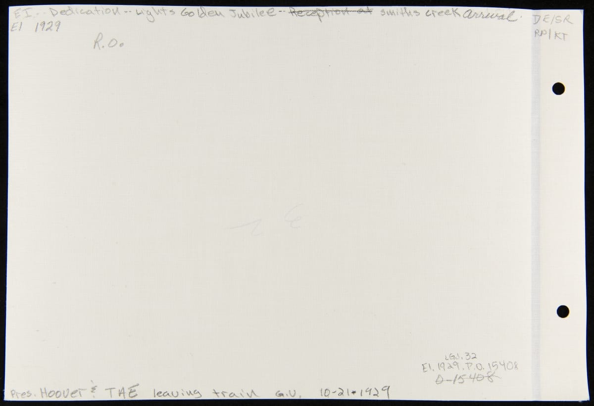 On October 21, 1929, Henry Ford hosted an elaborate celebration in Dearborn, Michigan, to honor his friend Thomas A. Edison. Known as Light's Golden Jubilee, the date marked the 50th anniversary of Edison's invention of a practical incandescent lamp. The day's festivities began with Edison's arrival -- escorted by Ford and President Hoover -- at Smiths Creek Station in Ford's Greenfield Village.