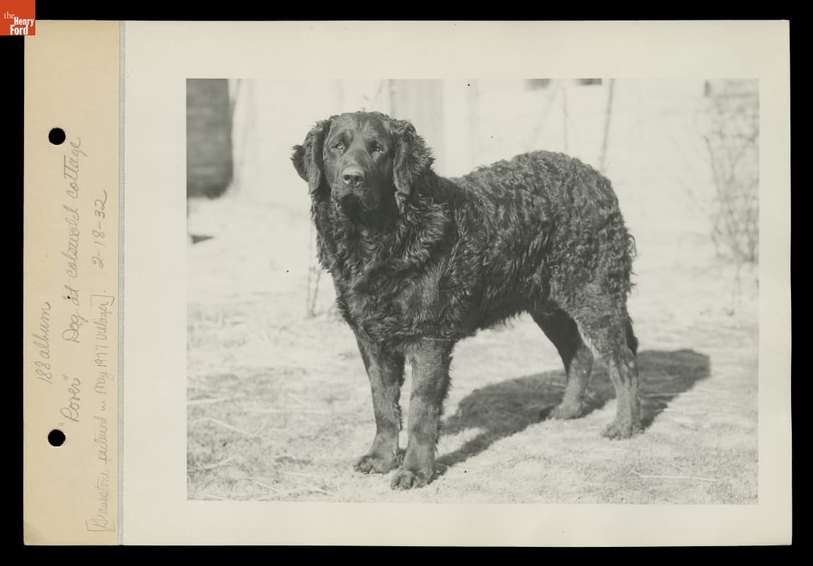 Henry Ford purchased a black Newfoundland puppy in 1930. The dog, named Rover, would help guard sheep at Greenfield Village's Cotswold Cottage. (Ford envisioned the interpretation of the cottage as the home of an English sheepherder.) The dog became a fixture in the Village. Rover was beloved by many: Gus Munchow--his trainer, Ford, and the schoolchildren of the Edison Institute.