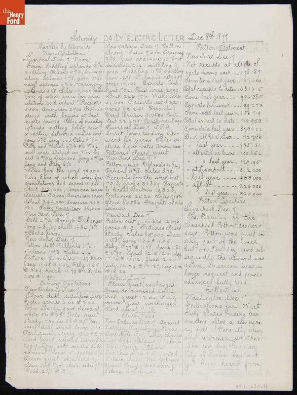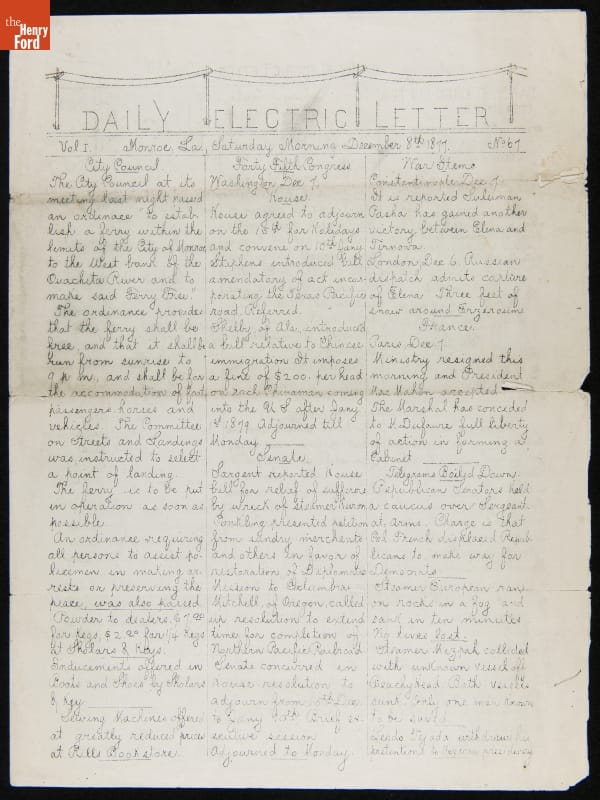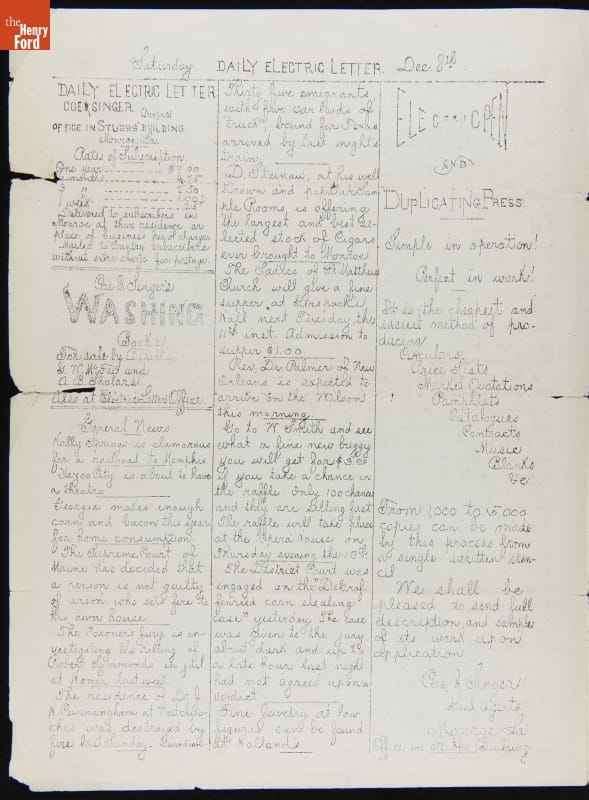 "Daily Electric Letter" Newspaper for December 8, 1877, Vol. 1, No. 69, Made with the Edison Electric Pen and Duplicating Press
