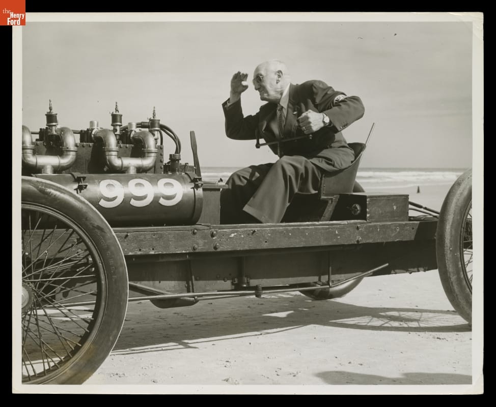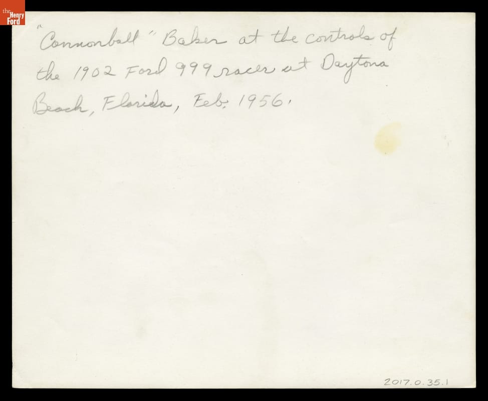 Erwin "Cannon Ball" Baker at the Controls of the 1902 Ford "999" Race Car, 1956