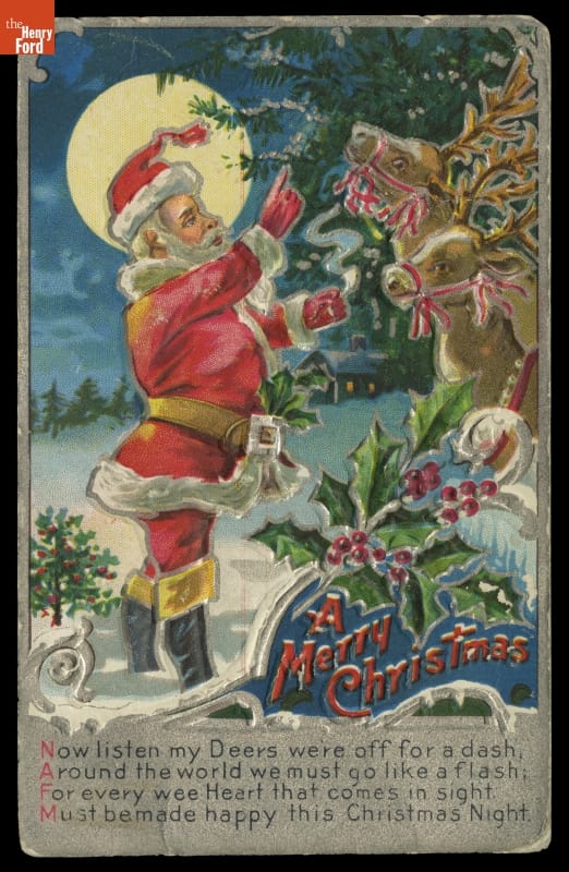 on front: Merry Christmas / Now listen my Deers we're off for a dash, Around the world we must go like a flash; For every wee Heart that comes in sight Must be made happy this Christmas Night.