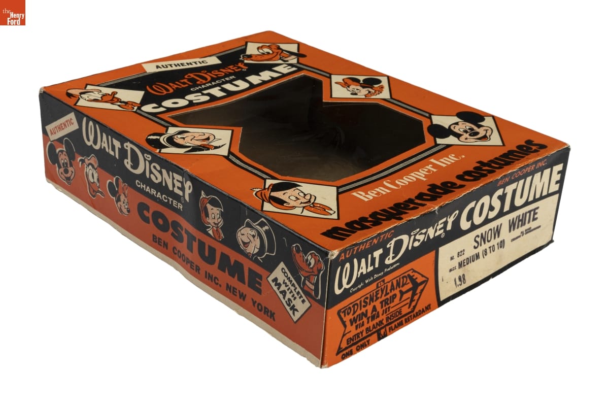 on top of packaging: AUTHENTIC WALT DISNEY CHARACTER COSTUME / Ben Cooper Inc. / masquerade costumes on back of packaging: BEN COOPER - SPOTLITE / MASQUERADE COSTUMES / WALT DISNEY COSTUMES & MASKS / SANTA CLAUS SUITS - PLAYSUITS / SPOTLITE MASKS / BEN COOPER INC - NEW YORK on front of packaging: AUTHENTIC WALT DISNEY COSTUME / BEN COOPER INC. / Copyright Walt Disney Productions / TO DISNEYLAND WIN A TRIP VIA TWA JET ENTRY BLANK INSIDE / ONE ONLY / FLAME RETARDANT / NO. 822 / SNOW WHITE / SIZE MEDIUM (8 TO 10) ALL RAYON / EXCLUSIVE OF ORNAMENTATION on sides of packaging: AUTHENTIC WALT DISNEY CHARACTER COSTUME / COMPLETE WITH MASK / BEN COOPER INC. NEW YORK