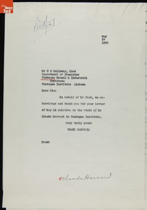Correspondence between Frank Campsall (for Henry Ford) and N. O. Calloway regarding Claude Harvard's Visit to Tuskegee Institute, May 1935