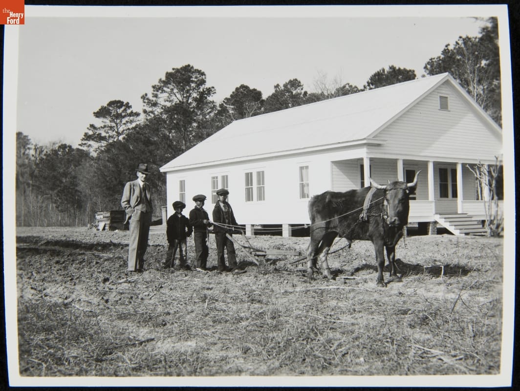 Henry Ford and Three Youngsters with a Cow Harnessed to a Plow, Richmond Hill, Georgia, circa 1941