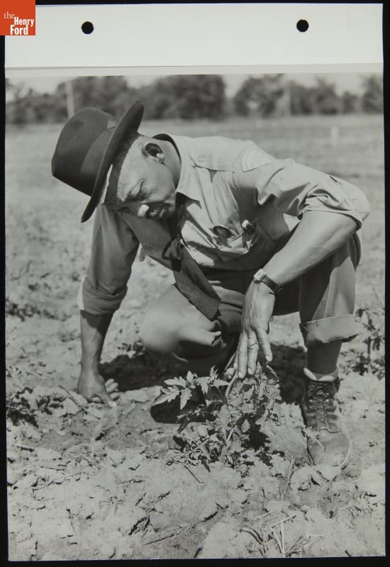 Man Inspecting Tomato Plant in Victory Garden, June 1944