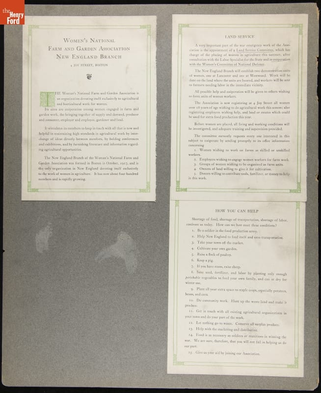 After the United States entered World War I in 1917, Americans worried about labor and food shortages as a result of men going off to fight. Organizations like the Woman's Land Army of America and the Woman's National Farm and Garden Association recruited and trained women to perform agricultural work across the country.