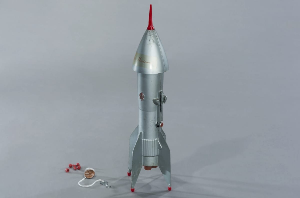 In the years before the space race of the late 1950s, many Americans viewed outer space exploration as fantasy and science fiction. Children's space toys--including banks--reflected those futuristic visions. This "Guided Missile" bank, made by Astro Manufacturing about 1957, contains a spring-loaded mechanism that launched a coin into a slot in the underside of the rocket's nose.
