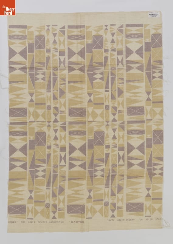 on side of fabric: DESIGN" FOR ADLER SCHNEE ASSOCIATES "SEMAPHORE" "RUTH ADLER DESIGN" FOR ADLER SCHN[sic] on paper tag: Semaphore on sheerlin / schnee & schnee