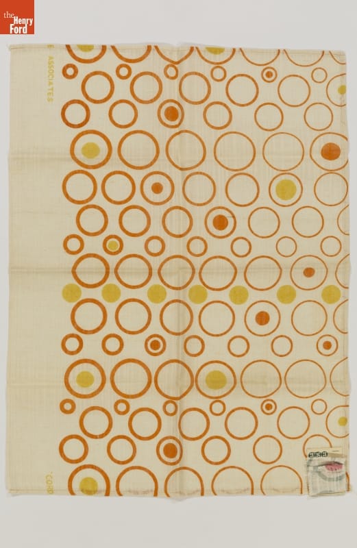 on side of fabric: CORD / ASSOCIATES on front of paper tag: asa / ADLER-SCHNEE ASSOCIATES / CONTEMPORARY HAND PRINTED TEXTILES / RUTH ADLER DESIGNS [...] / FABRIC sheerlin / DESIGN CORDWOOD / COLOR custom - orange & gold / REPEAT 26" / WIDTH 52" / STOCK / PRICE on back of paper tag: WHEN ORDERING...specify background fabric, design, placement of colors in design and include color samples with order. Be sure sufficient yardage is ordered as an exact match on reorders cannot be guaranteed. 10 yard minimum on all Custom orders.