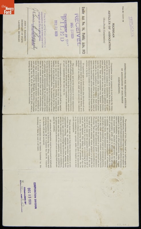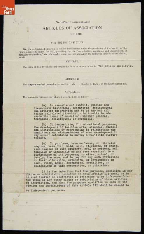 The Edison Institute--now known as The Henry Ford--was incorporated as a non-profit, educational institution in December 1929. Its Articles of Association named Henry, Clara, and Edsel Ford as officers and trustees. Ford believed the everyday objects he loved to collect reflected American progress not recorded in written histories. Ford's intent? To use the best of the ordinary and extraordinary works of America's people to teach and inspire.