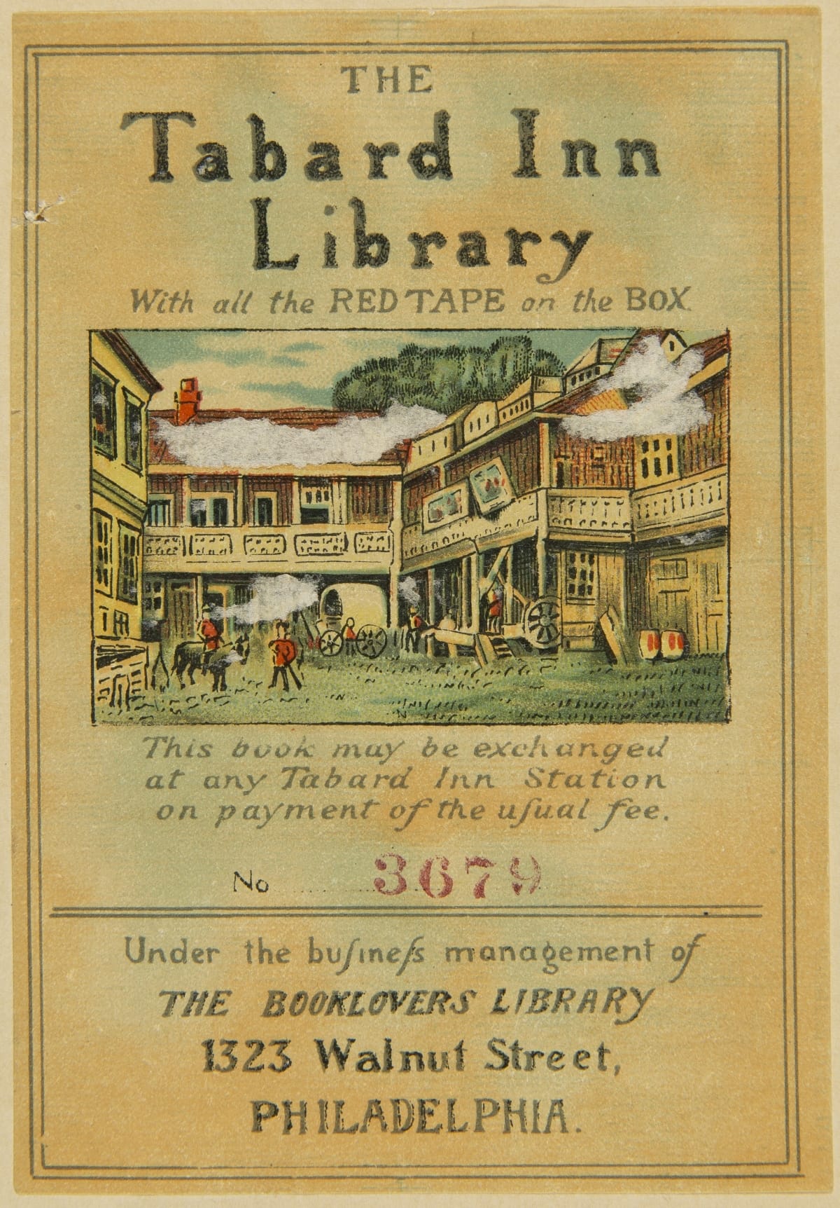 on front: THE Tabard Inn Library / With all the RED TAPE on the BOX / This book may be exchanged at any Tabard Inn Station on payment of the usual fee. / No. 3671 / Under the business management of THE BOOKLOVERS LIBRARY / 1323 Walnut Street, PHILADELPHIA