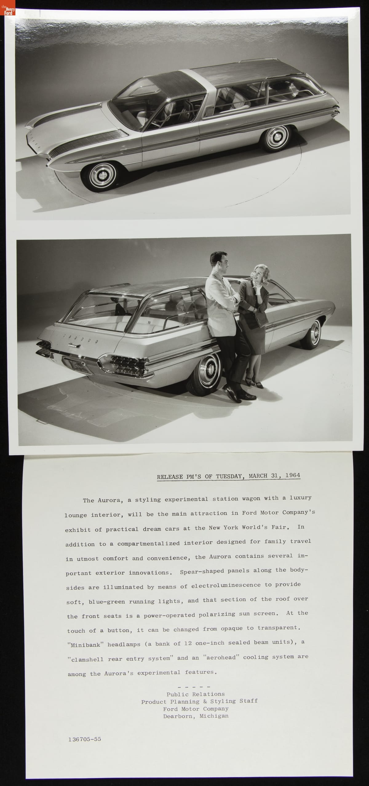 Ford debuted its Aurora concept car at the 1964 New York World's Fair. The futuristic station wagon featured illuminated panels along its body sides; a polarizing sunroof that changed from transparent to opaque with the push of a button; and, instead of a conventional steering wheel, a powered steering bar that required just one half turn from lock to lock.