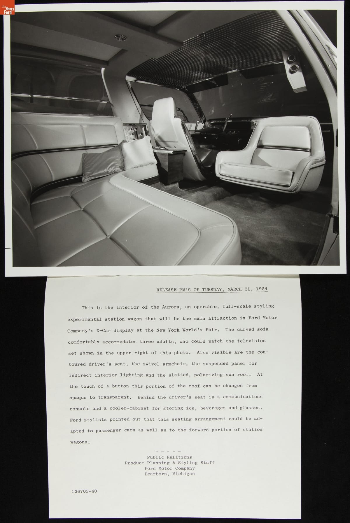 Ford Motor Company introduced its Aurora concept car at the 1964 New York World's Fair. The station wagon's futuristic features included an interior "communications console" that could operate an AM/FM radio, a television set, and a sound recording device. The Aurora also contained a table with a cabinet for storing ice and beverages.