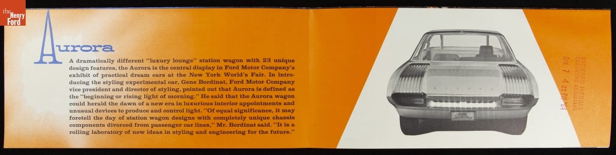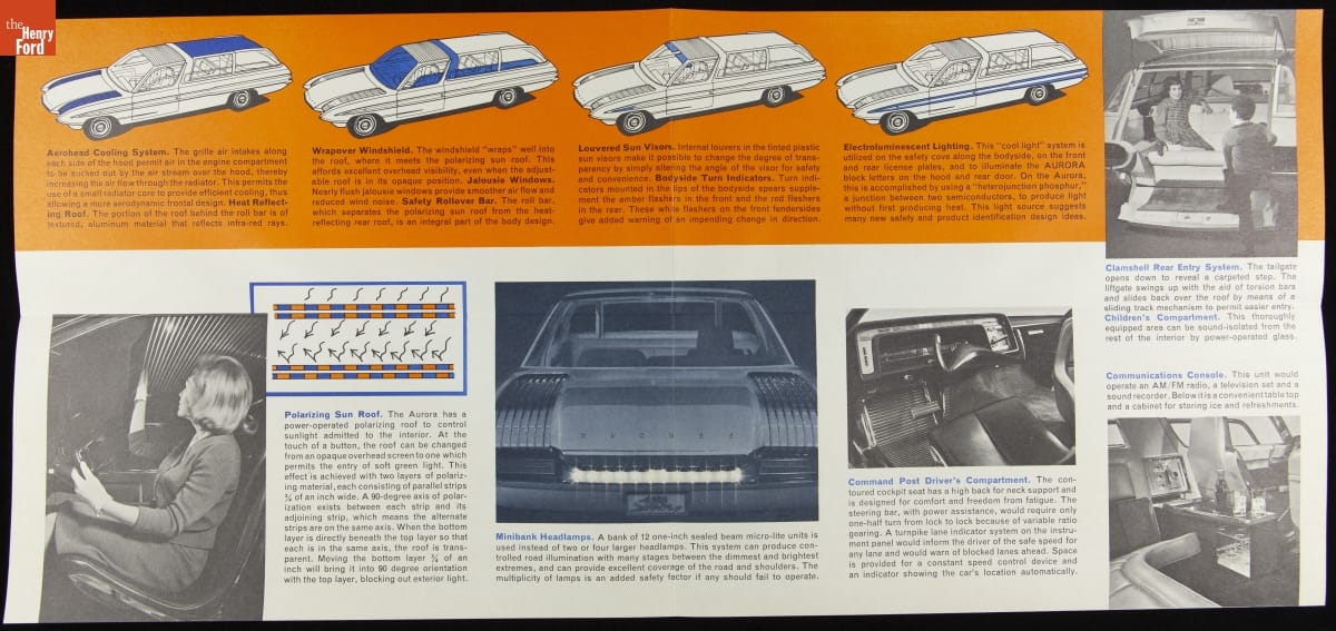 Ford debuted its Aurora concept car at the 1964 New York World's Fair. The futuristic station wagon featured illuminated panels along its body sides; a polarizing sunroof that changed from transparent to opaque with the push of a button; and, instead of a conventional steering wheel, a powered steering bar that required just one half turn from lock to lock.