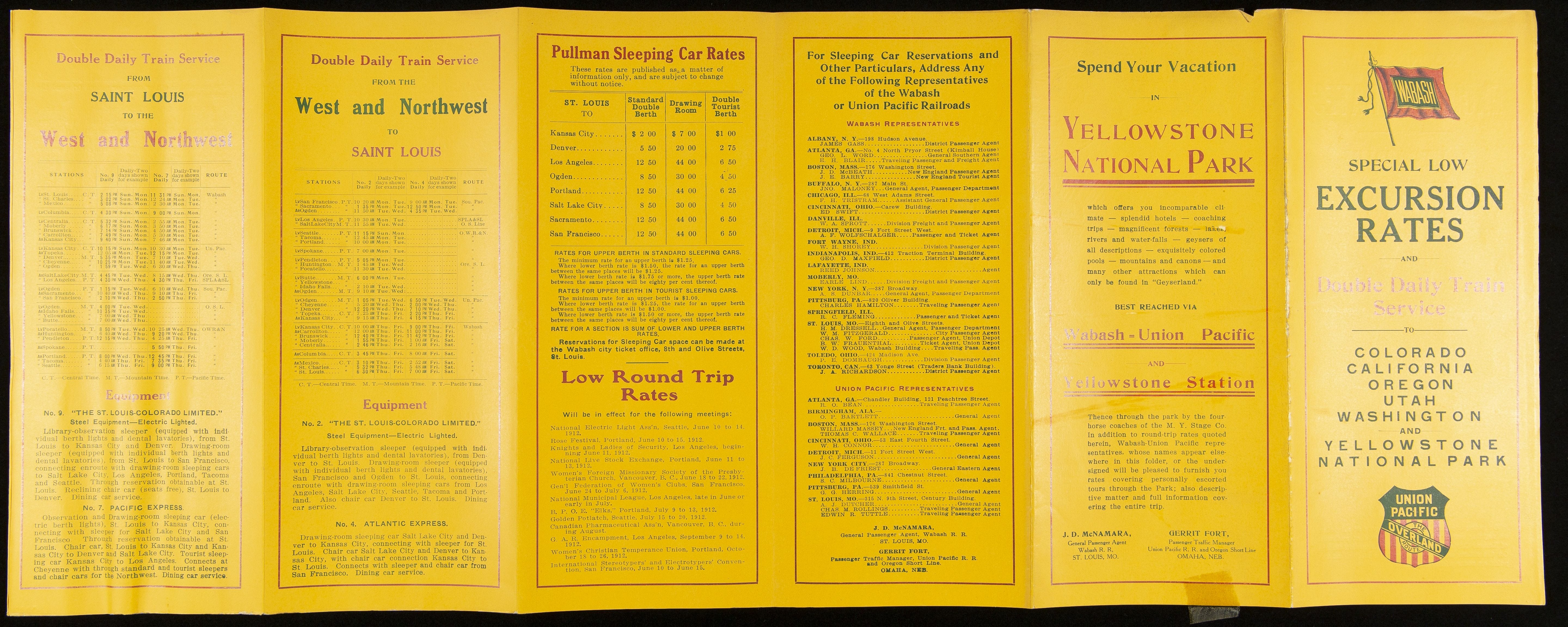 The Wabash Railway, with origins dating back to 1838, was a strong Midwestern carrier until Amtrak took over the national passenger railroad system in 1971. This timetable advertised Wabash's passenger trains to the western United States, operated jointly with Union Pacific. Low-cost "colonist" fares were offered to attract immigrant travelers heading west to start new lives.