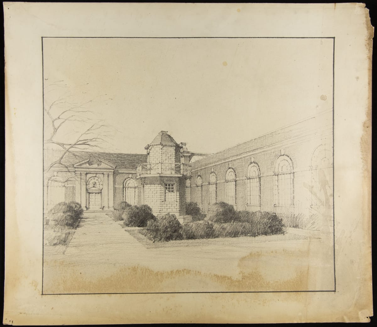 One of a series of views of the Museum as built, this black and white drawing shows one of two courtyards located between the entrance Promenade and the exhibit gallery. Filled with trees, plantings and a decorative gazebo, architect Robert Derrick intended these spaces to provide light, air and vistas from the Museum and Promenade.