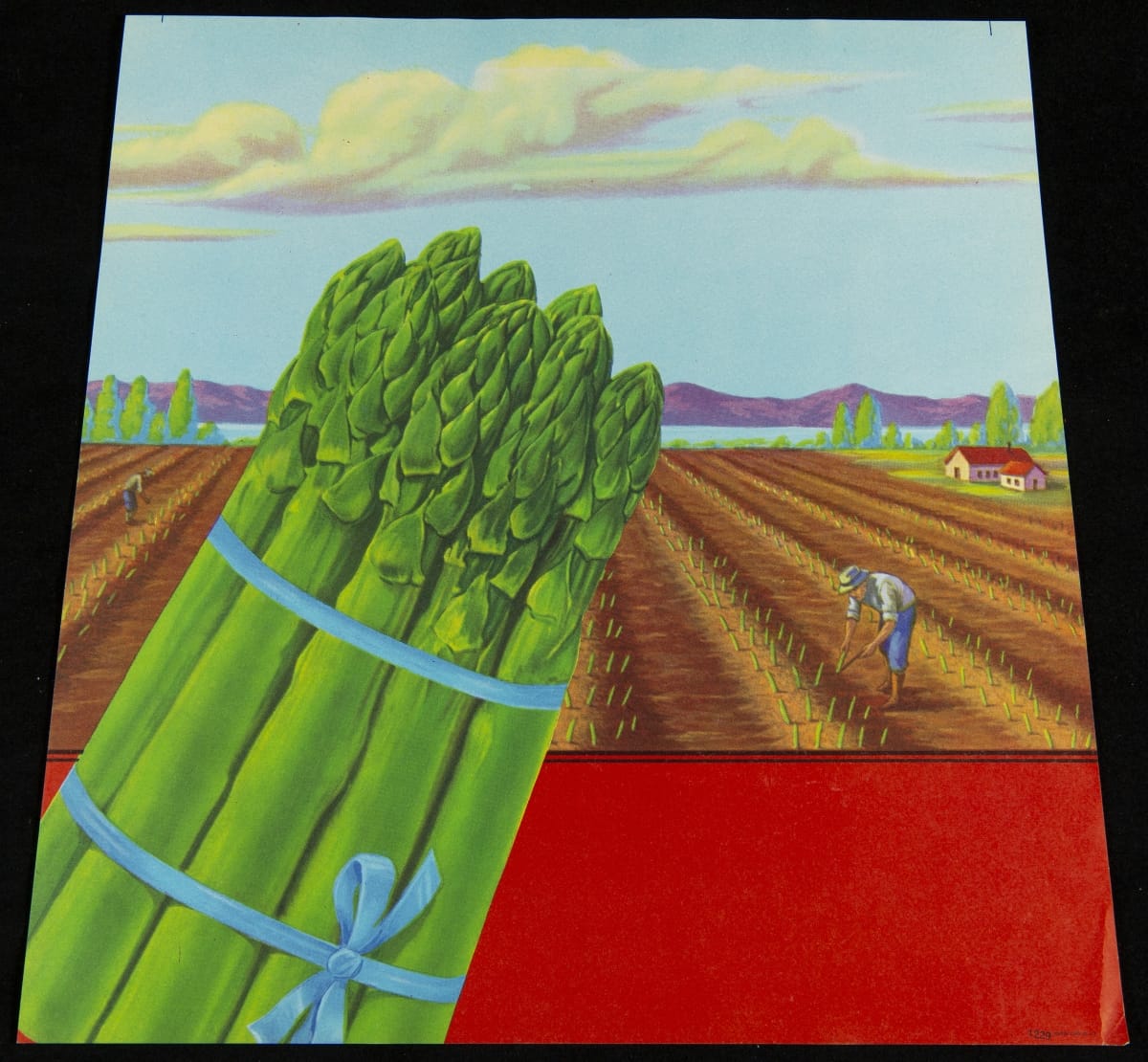 While many lithography firms of the-late 19th to early 20th-centuries created custom labels for companies, they also created stock labels devoid of product or company identification. A cheaper alternative to custom designs, stock labels allowed a generic image to be selected and the brand name to be incorporated into the design. This stock image for asparagus was created by the Schmidt Lithograph Company.