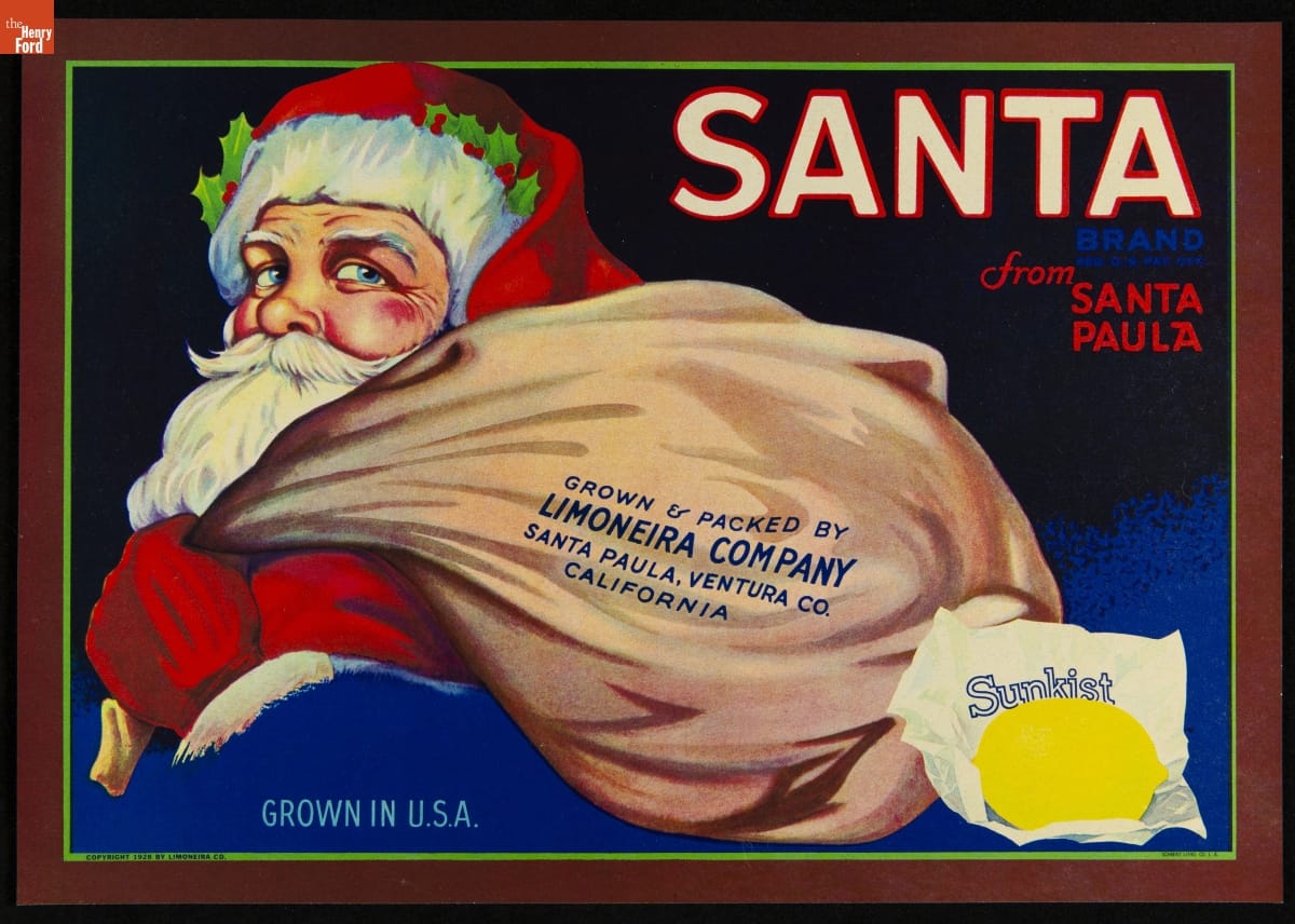 written on front: Santa / Brand / from / Santa Paula / Grown & packed by / Limoneira Company / Santa Paula, Ventura Co. / California / Sunkist / Copyright 1928 by Limoneira Co. / Schmidt Litho. CO. L.A.