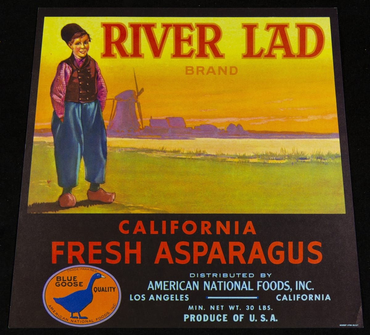 In 1869, the transcontinental railroad opened eastern markets to the West Coast produce industry for the first time. As produce companies shipped crates of fruits and vegetables across the country, they needed a way to distinguish their goods from their competitors'. Colorful, eye-catching labels, like this one for River Lad Brand Asparagus, were created to attract grocers purchasing goods from wholesale markets.