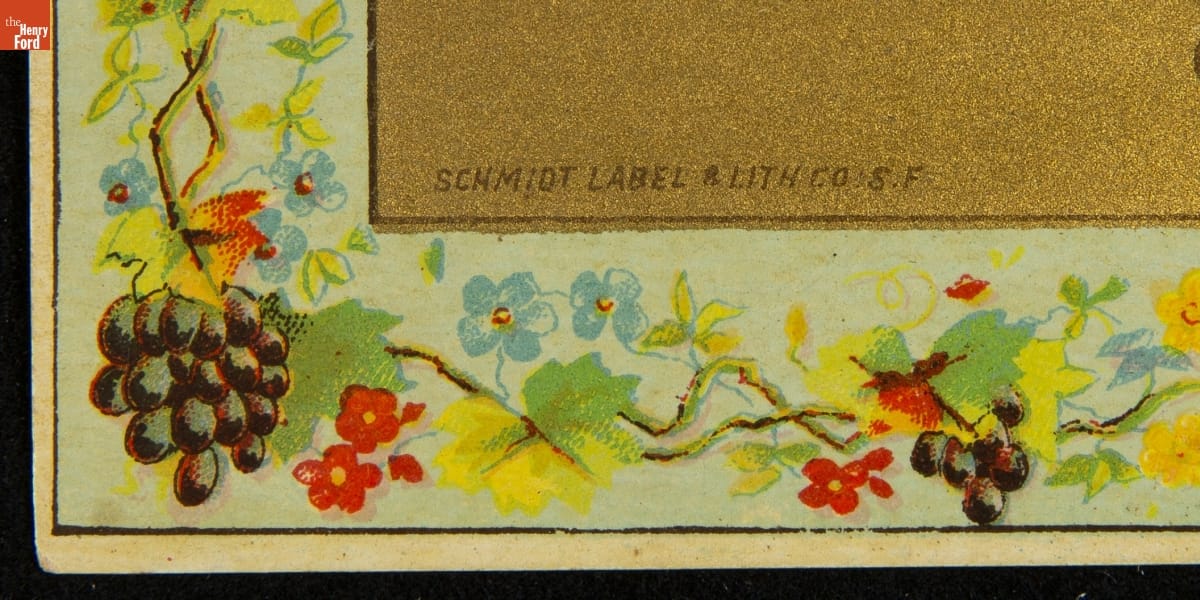 Labels of the late-19th to early-20th-centuries were colorful and eye-catching, often appearing like mini-posters. One of the most well-known lithographers was Max Schmidt, owner and founder of Schmidt Lithograph Company. This label for Edna Alma Rancho Brand Grapes was created by an earlier iteration of Schmidt's company -- the Schmidt Label and Lithograph Company.