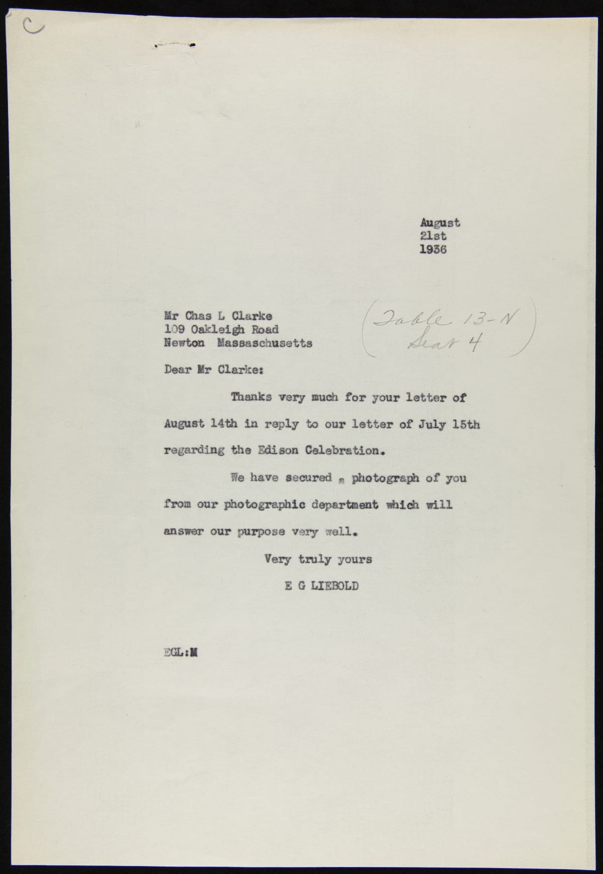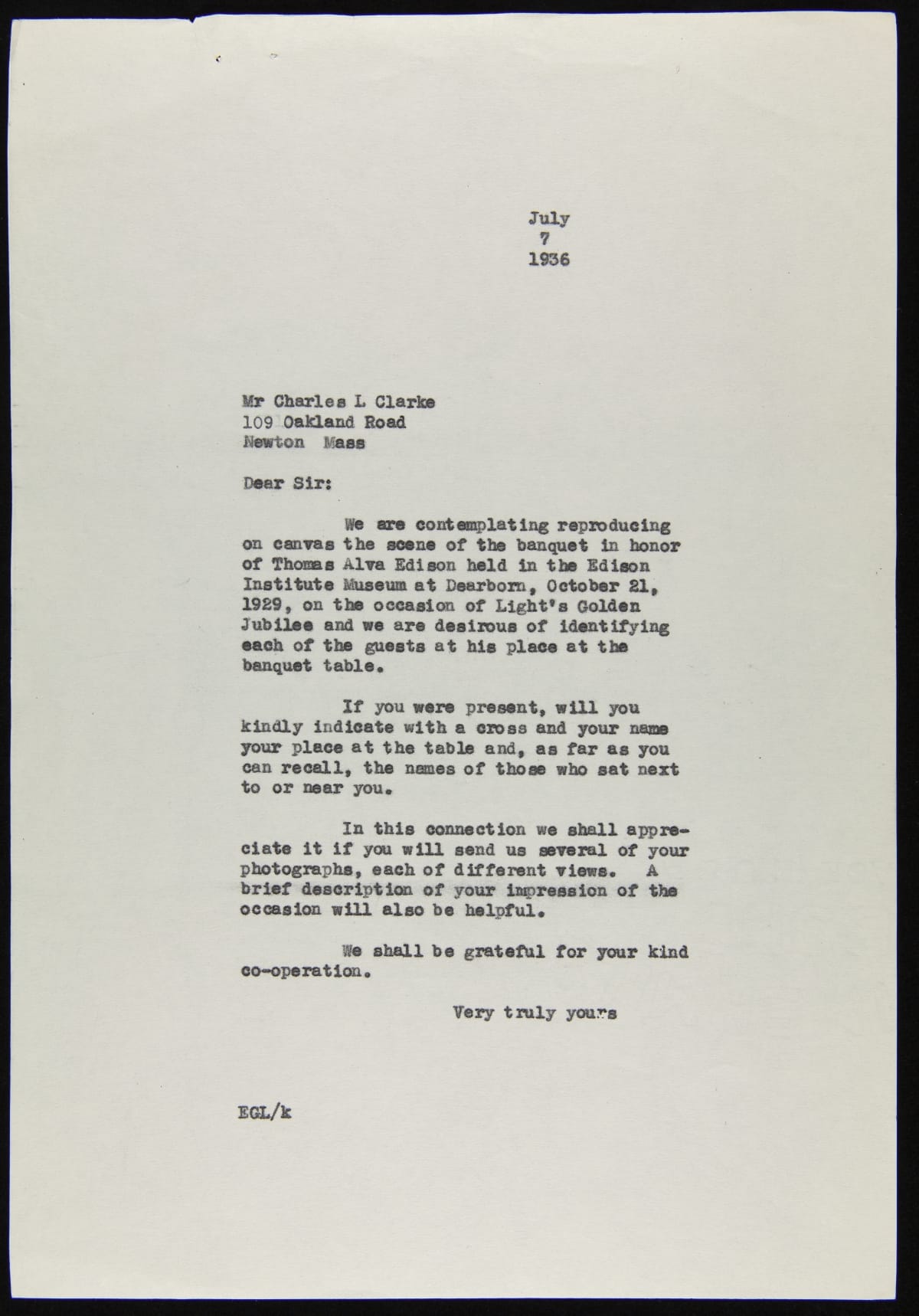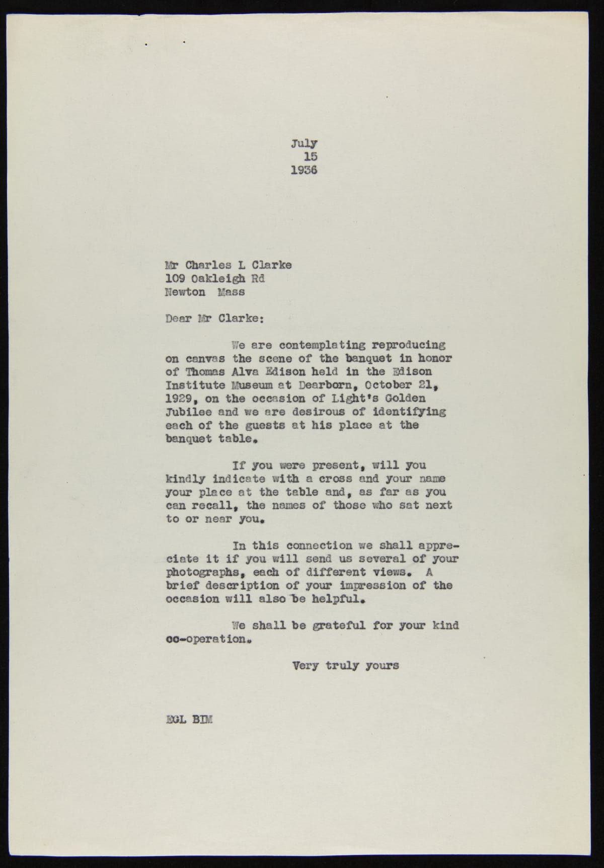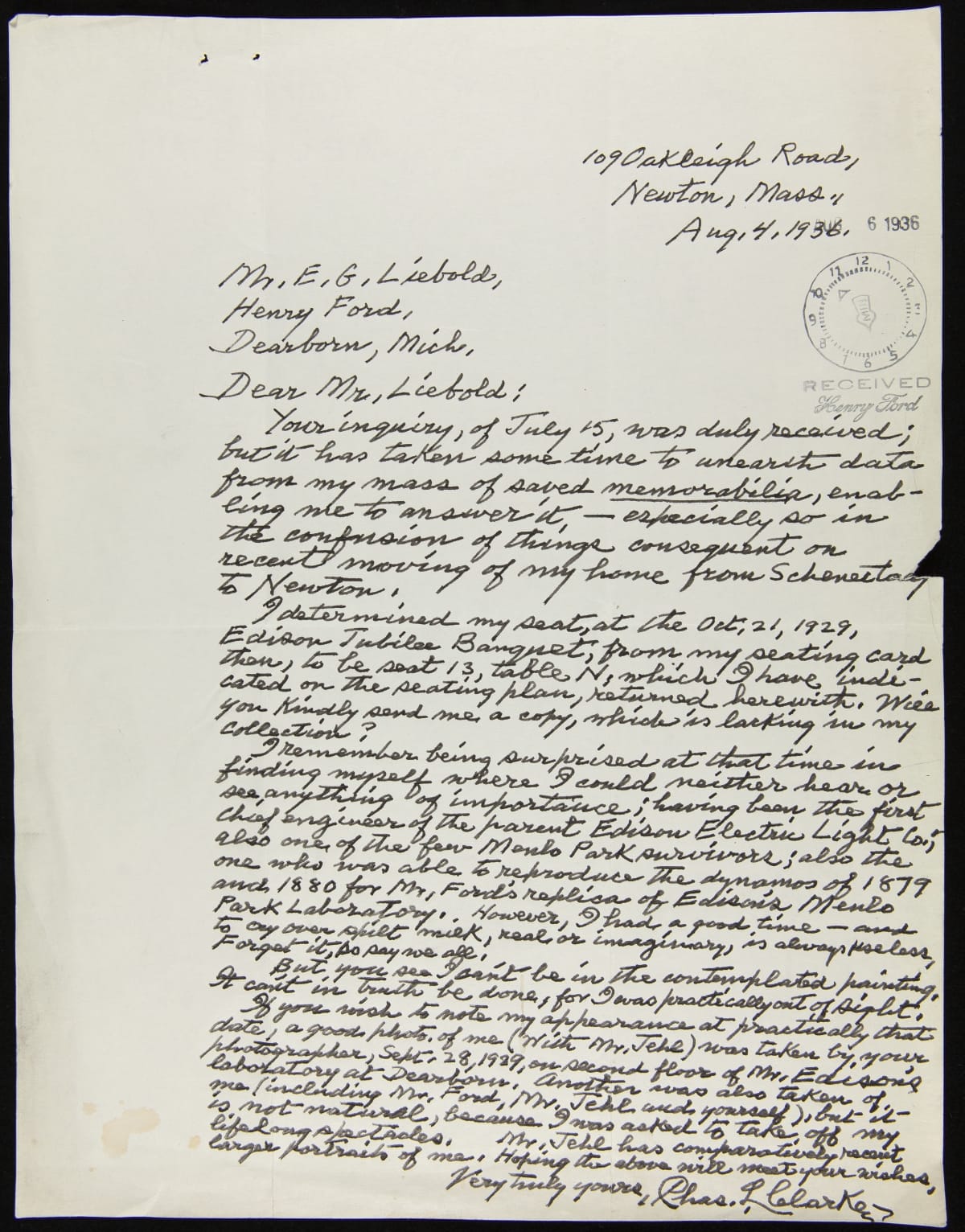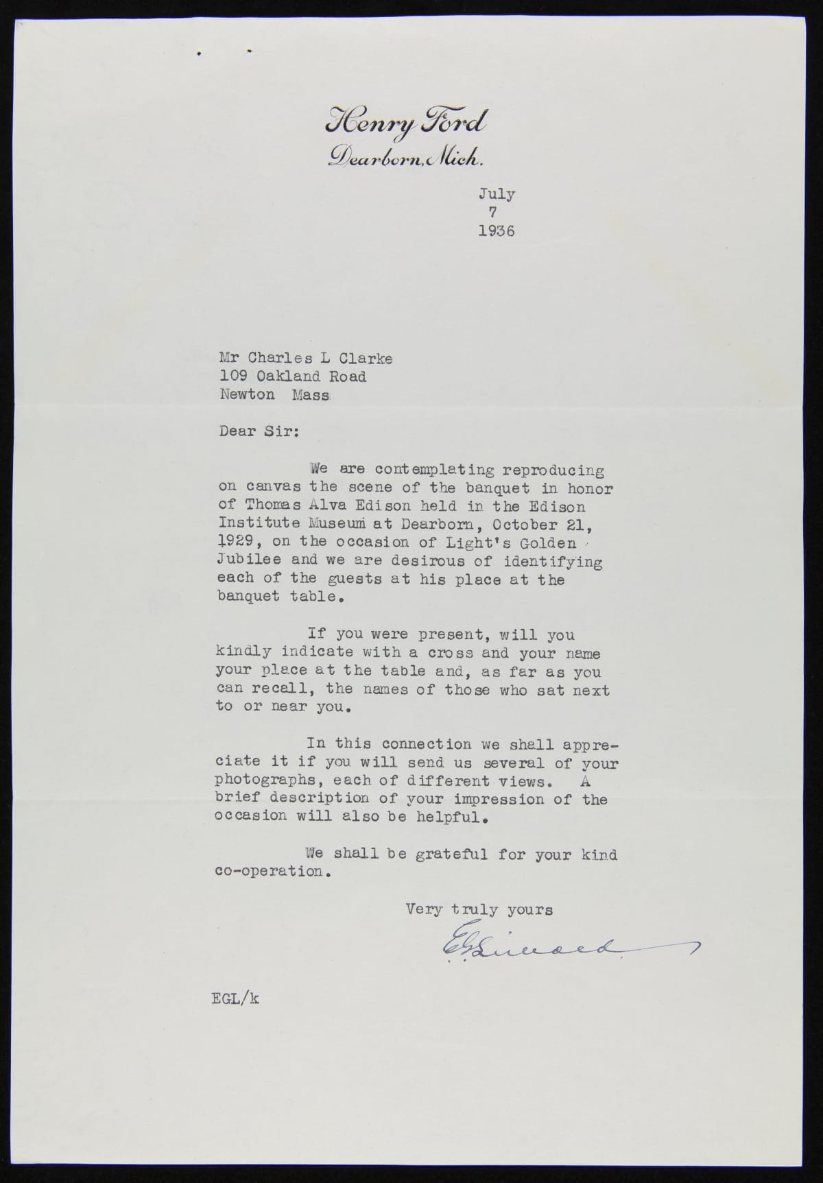 Correspondence between E.G. Liebold and Charles L. Clarke regarding Light's Golden Jubilee Banquet Painting, 1936
