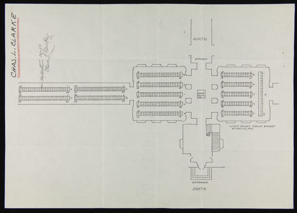In the mid-1930s, more than six years after the Light's Golden Jubilee celebration, Henry Ford commissioned a panoramic painting of that evening's banquet. Letters were sent to attendees asking them to indicate on an enclosed diagram where they sat. Charles Clarke remembered his location and wondered whether he could be in the painting, since where he was seated, he was "practically out of sight."