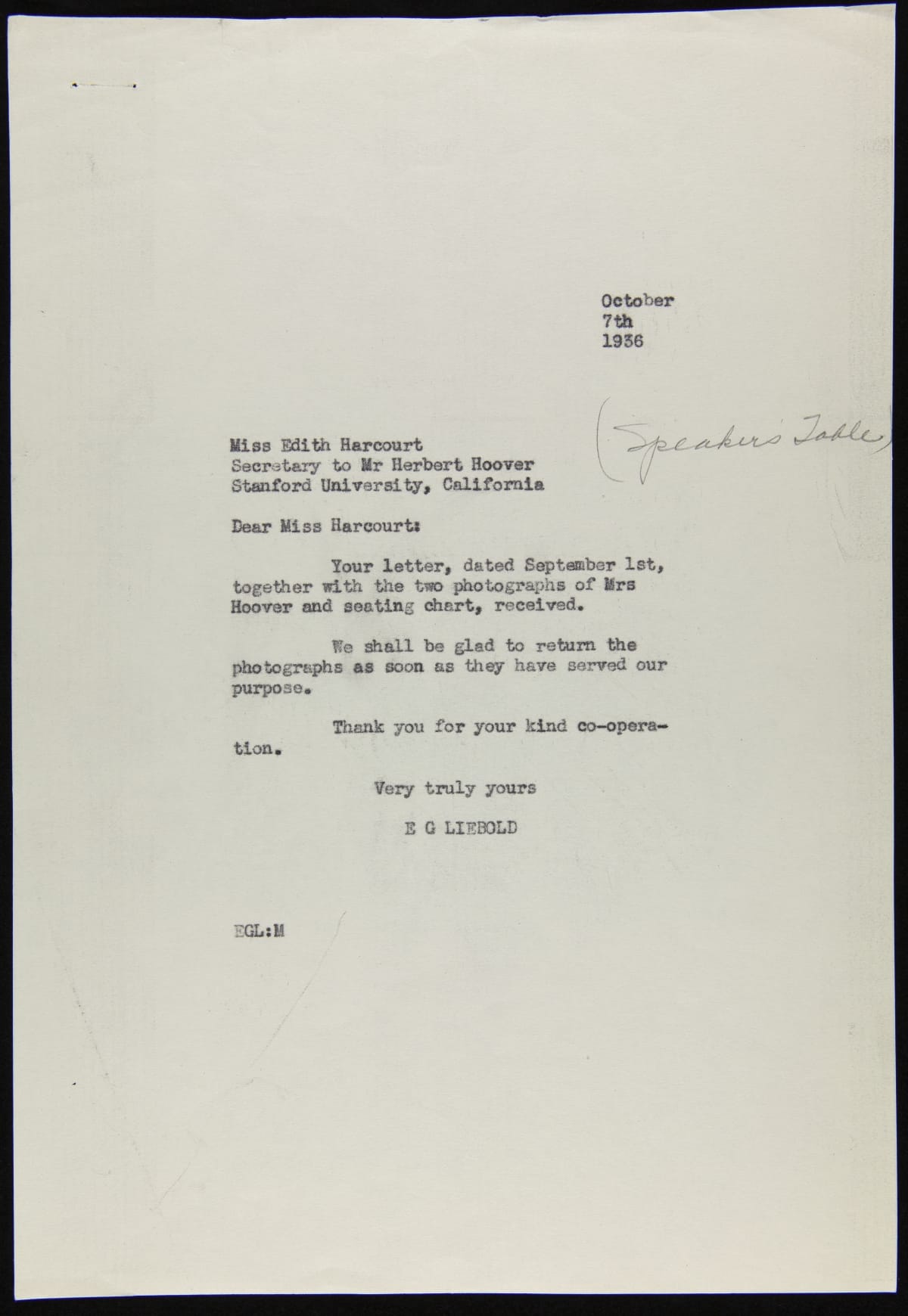 Correspondence between E.G. Liebold and Lou Henry Hoover regarding Light's Golden Jubilee Banquet Painting, 1936