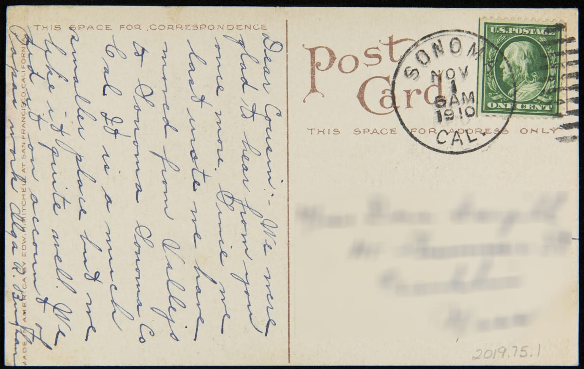 Luther Burbank (1849-1926), an American horticulturalist and author, gained a reputation for selective breeding that yielded more than 800 new fruits, vegetables, flowers, and other plants. This postcard shows him standing at his Bureau of Information, opened in 1910, across from his new home, built in 1906. The public could purchase seeds and souvenirs at the Bureau and drop postcards in the mailbox in front of the office.