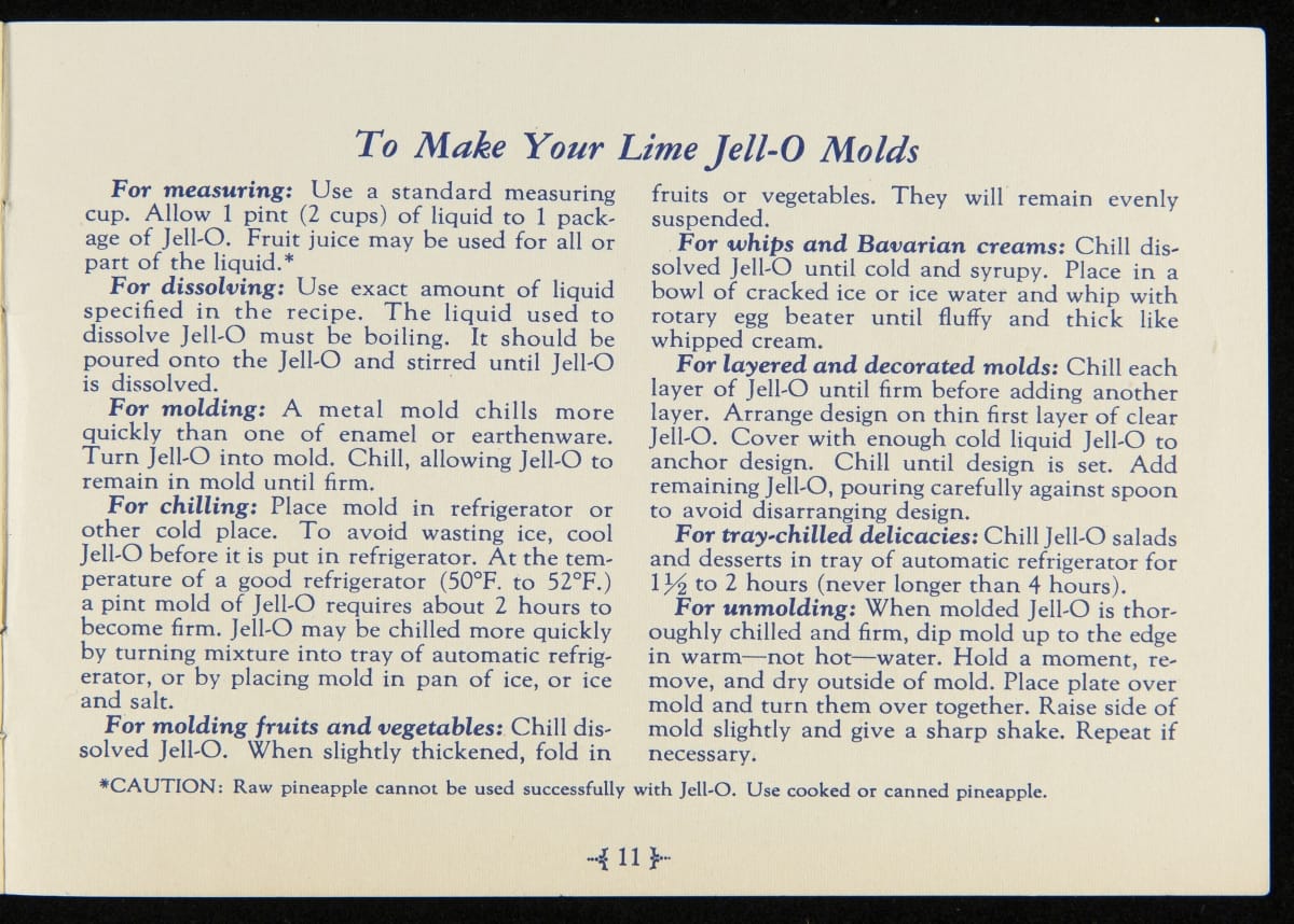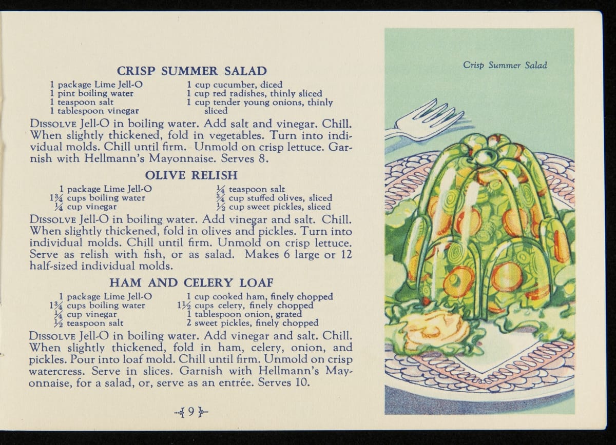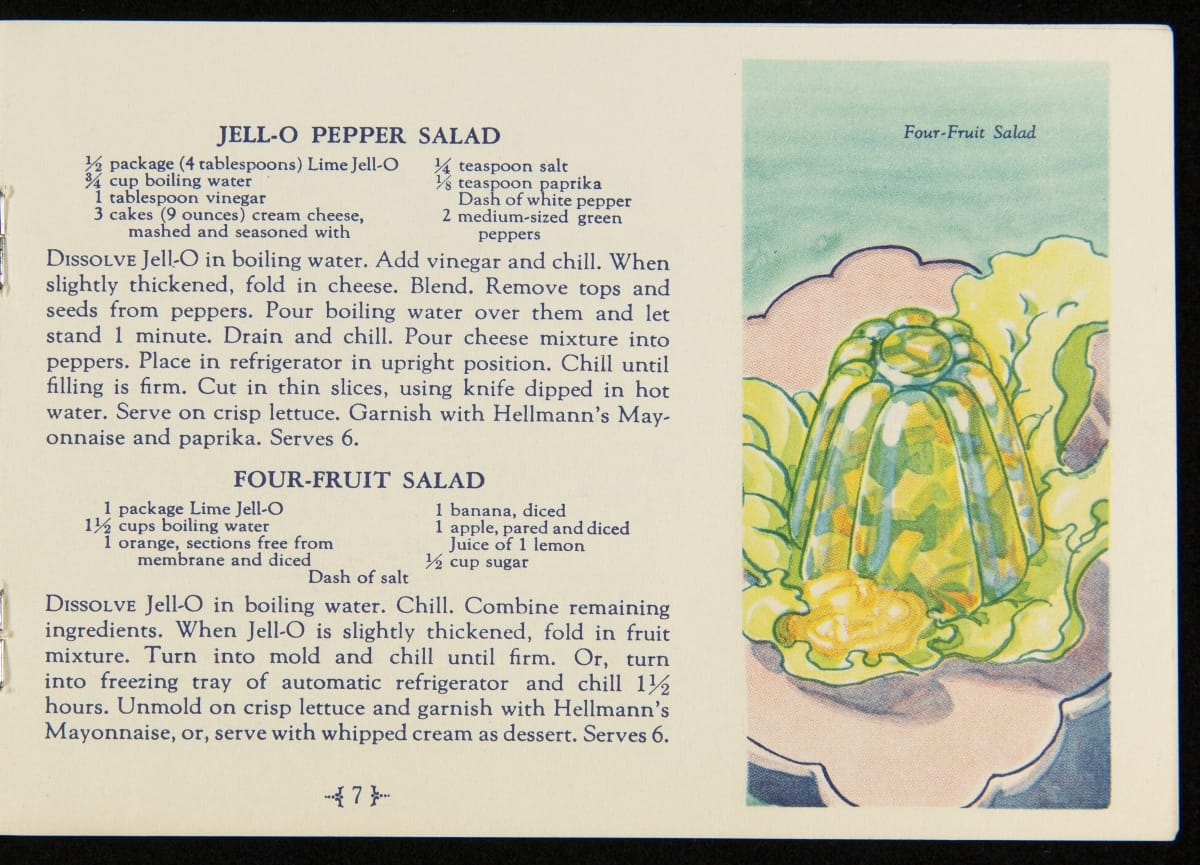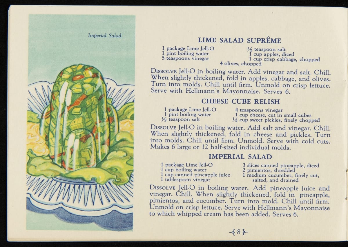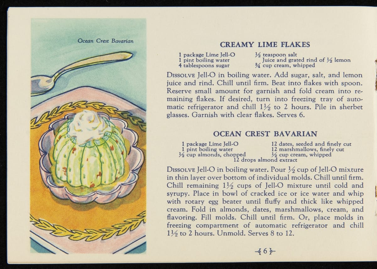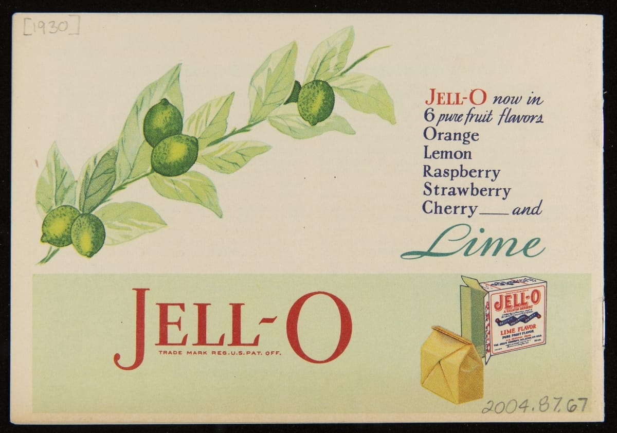 When Jell-O was first introduced in 1897, it was sold in four flavors: Strawberry, Raspberry, Orange, and Lemon. Over the next decade, the flavors of Cherry, Chocolate, and Peach were introduced with Lime Jell-O debuting in 1930. Recipe booklets, like this one, proved to be an invaluable marketing strategy, providing homemakers with creative uses for the ready-made product.
