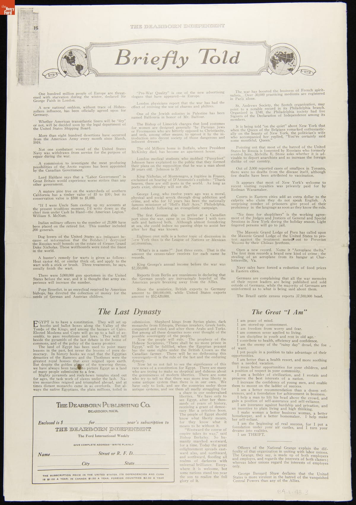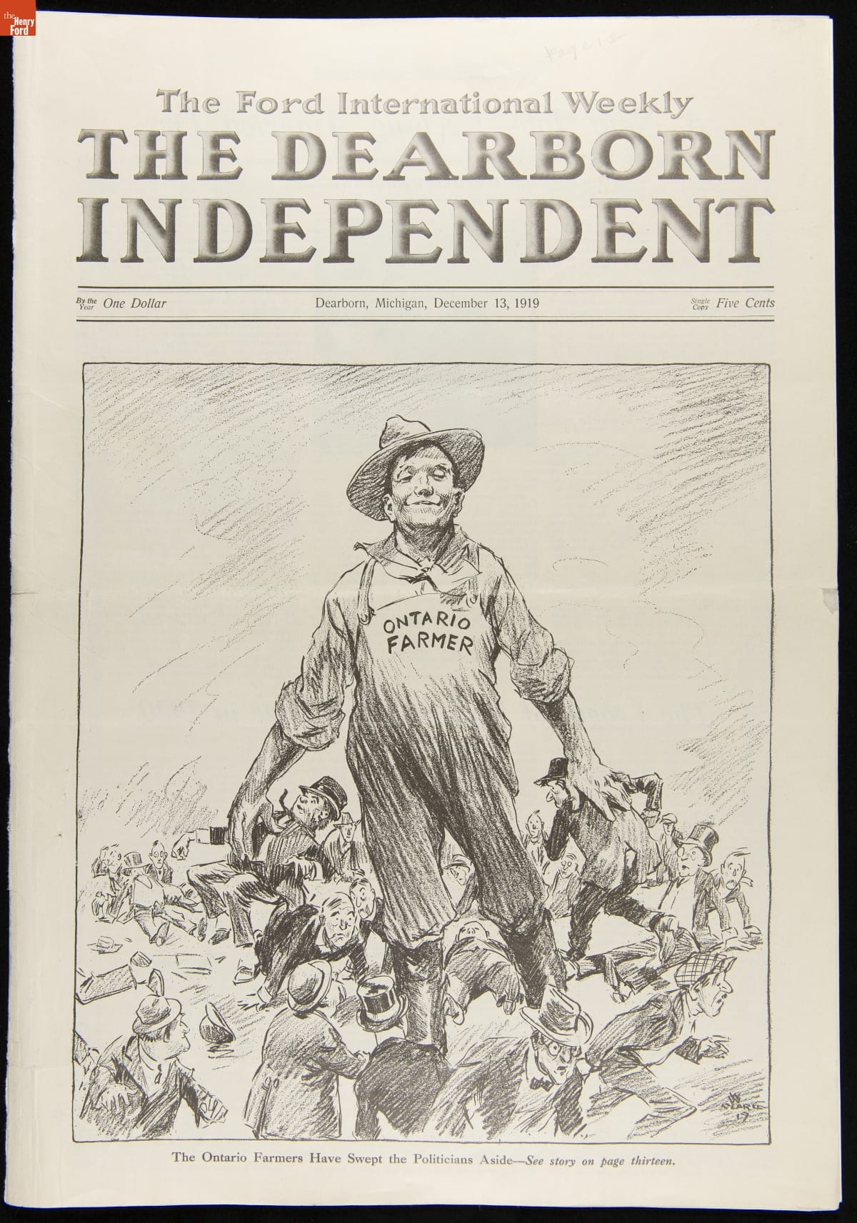 Henry Ford purchased The Dearborn Independent and published it under his name from 1919 to 1927. It served as a forum for Ford's views, free from other media outlets that had attacked his work and values and were outside his control. The Dearborn Independent covered world events, business and economic news, and fiction from noted authors. Sadly, it also served as an outlet for Ford's anti-Semitic sentiments. Between 1920 and 1922, the weekly paper ran a series of front-page articles that denounced all things Jewish. Even after this series, many articles contained anti-Jewish language. Though Ford later apologized and printed a retraction, these notoriously anti-Semitic editorials and articles forever tarnished the influential automaker's reputation.
