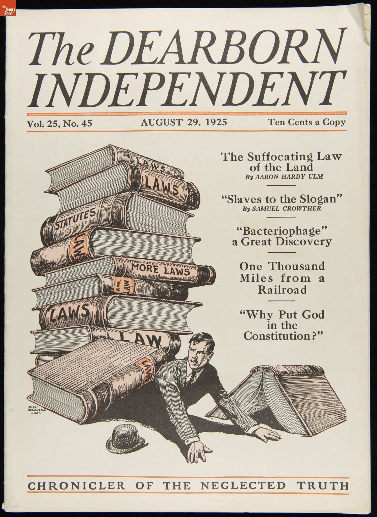 Henry Ford purchased The Dearborn Independent and published it under his name from 1919 to 1927. It served as a forum for Ford's views, free from other media outlets that had attacked his work and values and were outside his control. The Dearborn Independent covered world events, business and economic news, and fiction from noted authors. Sadly, it also served as an outlet for Ford's anti-Semitic sentiments. Between 1920 and 1922, the weekly paper ran a series of front-page articles that denounced all things Jewish. Even after this series, many articles contained anti-Jewish language. Though Ford later apologized and printed a retraction, these notoriously anti-Semitic editorials and articles forever tarnished the influential automaker's reputation.