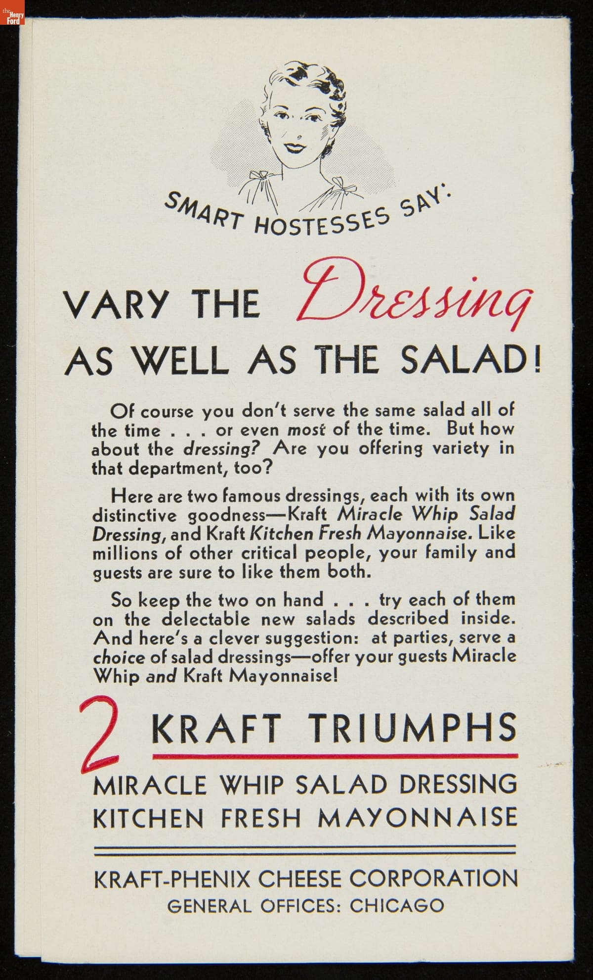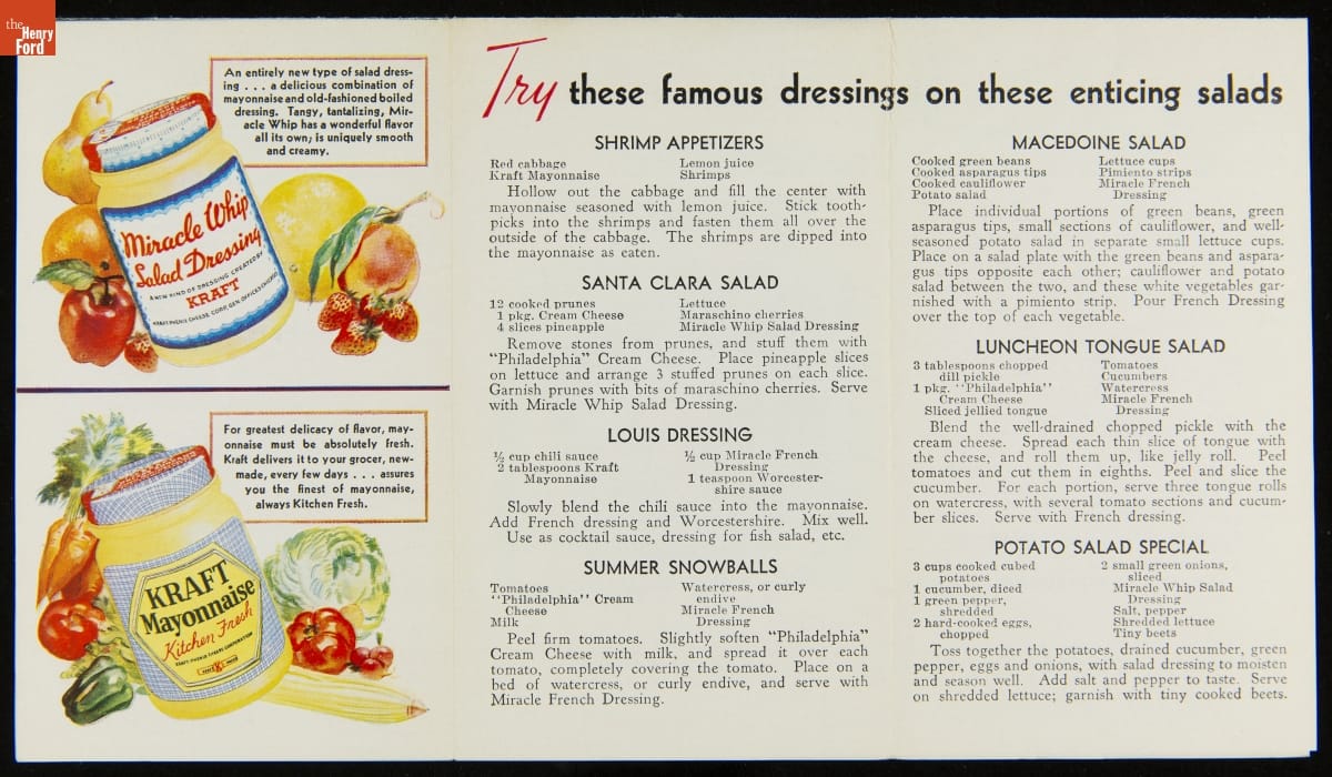 After finding success with the development of processed cheese in 1915, the J.L. Kraft and Bros. Co. began acquiring companies to diversify its product offerings. Among these acquisitions were companies specializing in mayonnaise. The company known as Kraft-Phenix, acquired in 1928, introduced its Kraft Mayonnaise in 1930, and a similar product, Miracle Whip, in 1933, often offering recipes to highlight each product's unique taste.