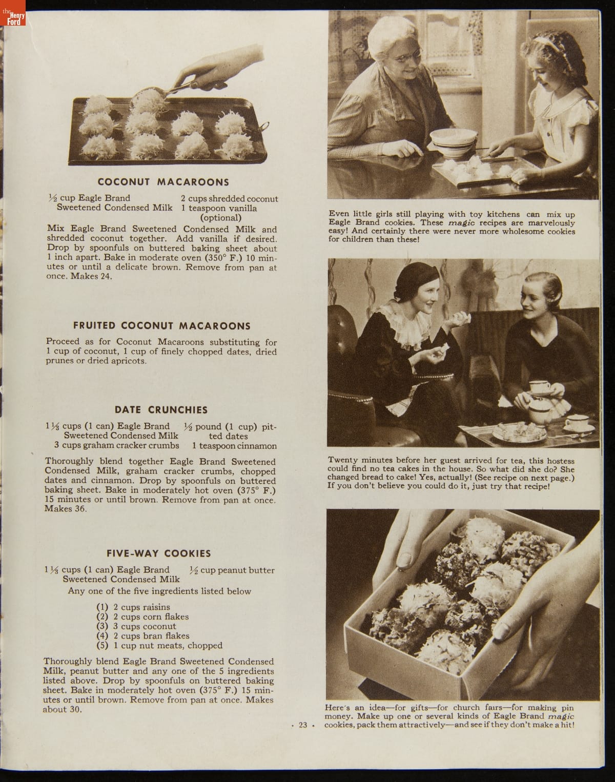 Before the invention of pasteurized milk, fresh milk was often unsafe to drink, as it soured quickly. After experimenting with ways to preserve milk, Gail Borden introduced Eagle Brand Sweetened Condensed Milk in 1856. What was advertised as nourishment for young children soon gained popularity as a baking and cooking ingredient. This booklet from 1935 features recipes using Borden's Condensed Milk.
